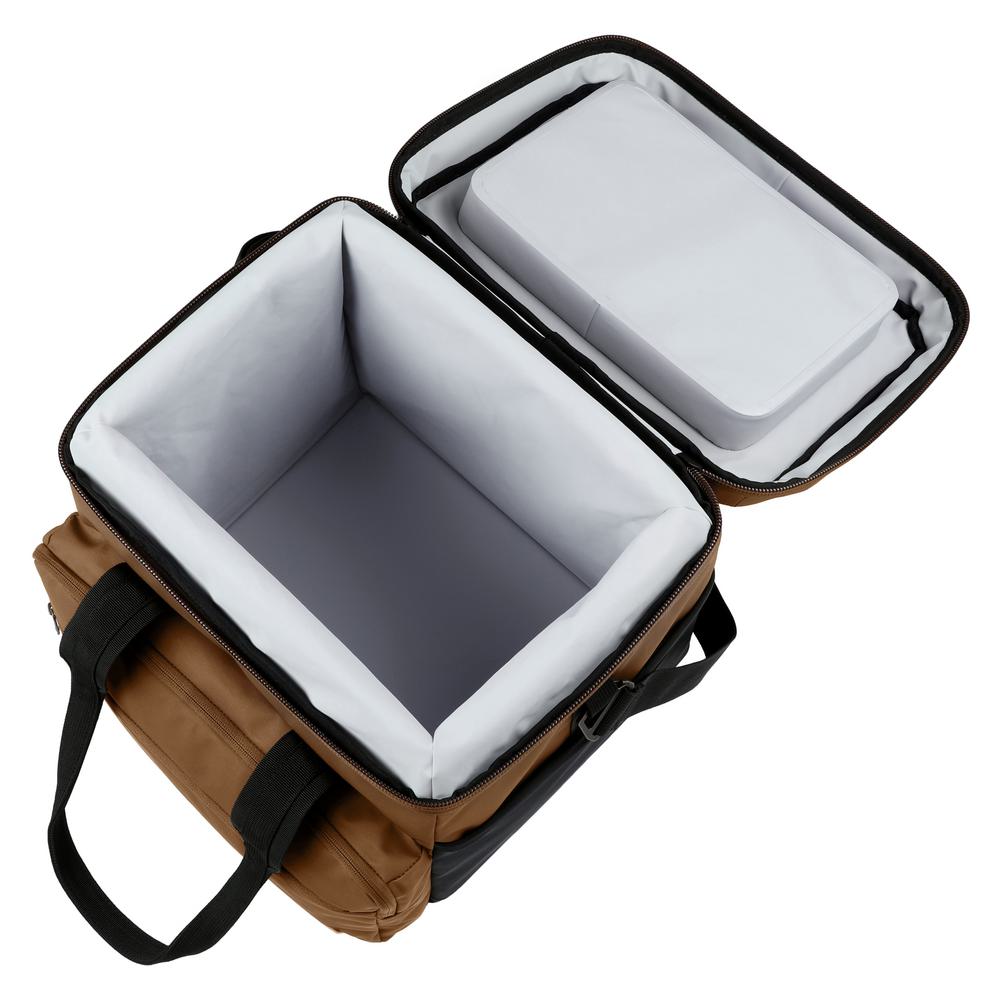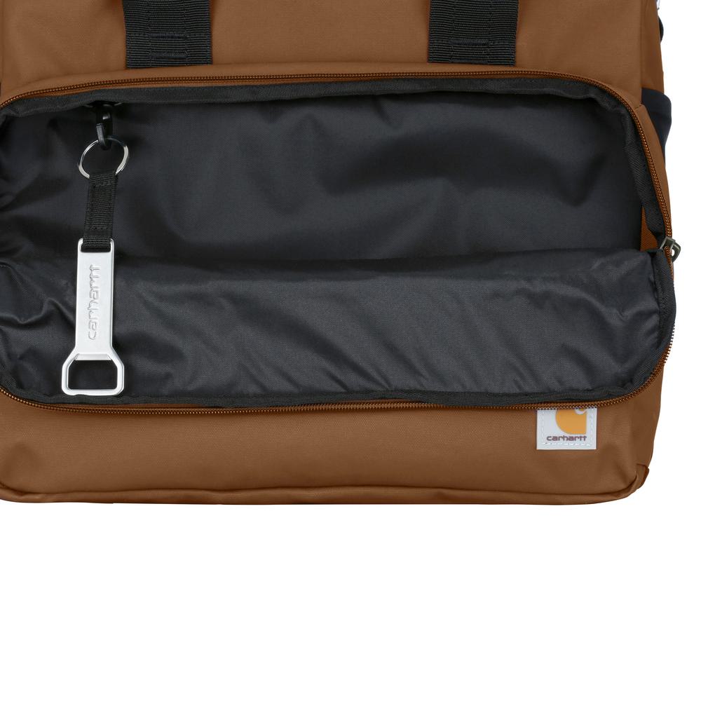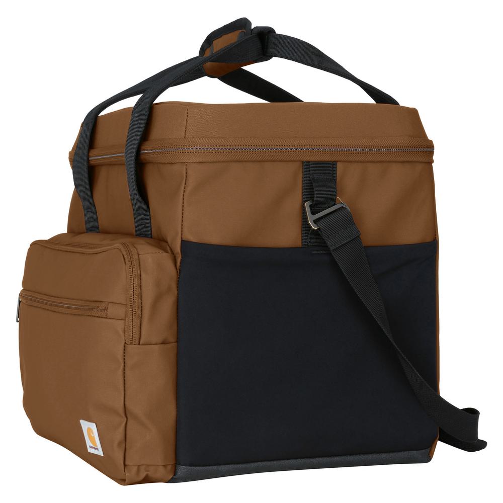 This Carhartt cooler keeps beverages cold for 24+ hours. It's made with thick foam insulation and has room for 24 cans as well as ice. A flip-top opening offers easy access, and a padded shoulder strap that's removable and adjustable makes it easy to carry. It comes equipped with a custom bottle opener.