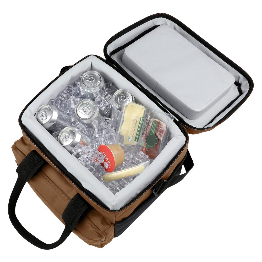 This Carhartt cooler keeps beverages cold for 24+ hours. It's made with thick foam insulation and has room for 24 cans as well as ice. A flip-top opening offers easy access, and a padded shoulder strap that's removable and adjustable makes it easy to carry. It comes equipped with a custom bottle opener.